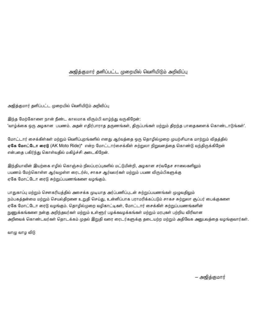 அஜித்குமார் தனிப்பட்ட முறையில் வெளியிடும் அறிவிப்பு: