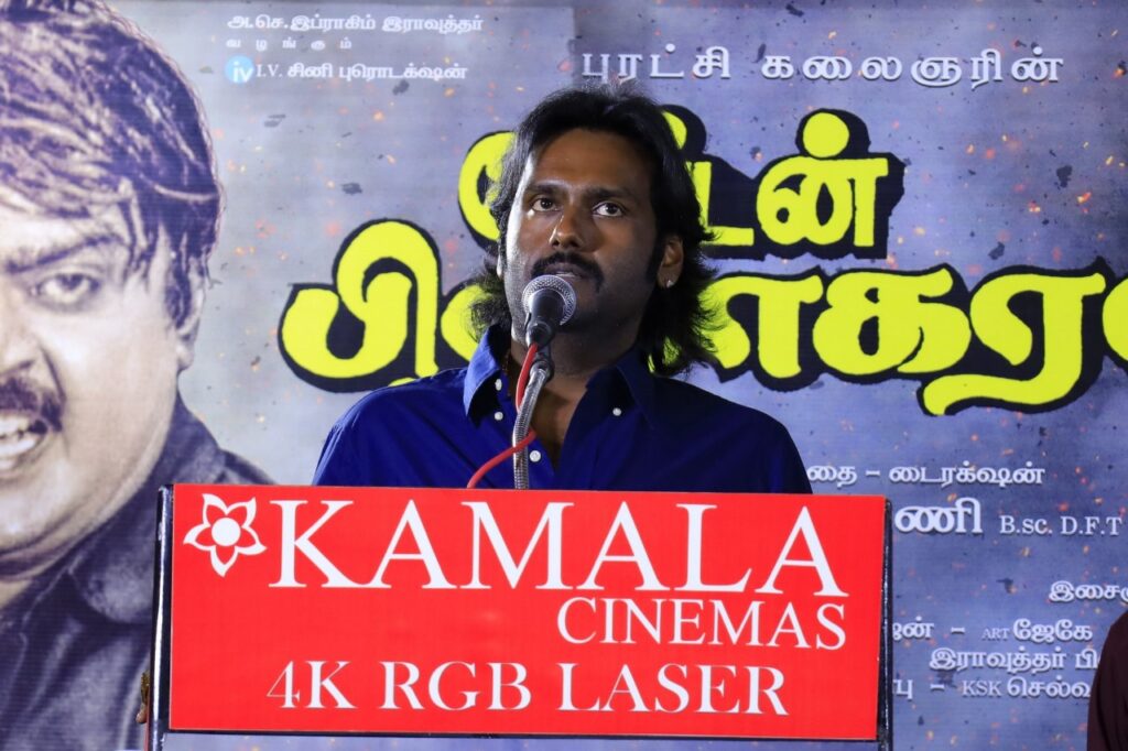 இப்போதைய சூழலில் உலக அழகி போன்ற கதாநாயகி, மிகப்பெரிய கேமராமேன், ஹாலிவுட் இருந்து மேக்கப் மேன் 100 கோடியை தொடக்கூடிய பிரம்மாண்டமான கதை என்று தான் பல பேர் எதிர்பார்க்கிறார்கள், ஆனால் விஜயகாந்த் கதையை மட்டுமே நம்பி வருவார், விஜயகாந்த் சாரை பொருத்தவரைக்கும் அரசியலில் நடிக்க தெரியாது. நிஜத்தில் எப்படி இருந்தாரோ அப்படியே இருந்தார். அதனாலேயே சில பேரின் கிண்டல்களுக்கு ஆளானார். மற்றவர்கள் உள் வாழ்க்கை, வெளி வாழ்க்கை என இரண்டு விதமாக இருப்பார்கள். ஆனால் கேபடனுக்கு அகமும் புறமும் ஒன்றே. நூறு ஜென்மத்திற்கு சேர வேண்டிய புண்ணியங்களை தனது வாரிசுகளுக்காக சேர்த்து கொடுத்துவிட்டு போய் இருக்கிறார் கேப்டன் விஜயகாந்த்” என்று கூறினார்.