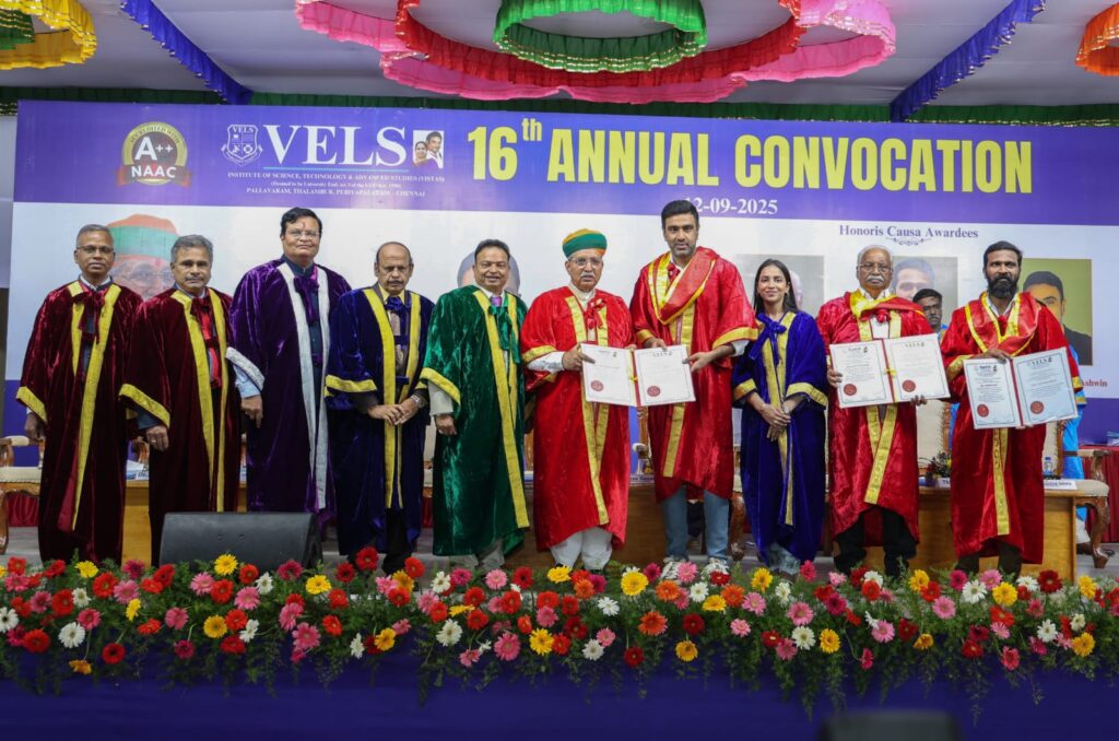 இடமிருந்து வலம் – வேல்ஸ் பல்கலைக்கழகத்தின் 16-வது பட்டமளிப்பு விழாவில், இடமிருந்து வலமாக – தேர்வுகள் தேர்வுகள் கட்டுப்பாட்டாளர் டாக்டர் A. உதயகுமார், பதிவாளர் டாக்டர் P. சரவணன், துணைவேந்தர் டாக்டர் M. பாஸ்கரன் (F.A.C) , இணை வேந்தர் டாக்டர் A. ஜோதி முருகன், நிறுவன-வேந்தர் டாக்டர் ஐசரி.கே. கணேஷ், முதன்மை விருந்தினராக மத்திய சட்ட & நீதி மற்றும் நாடாளுமன்ற விவகாரங்களுக்கான மத்திய அமைச்சர் திரு. அர்ஜுன் ராம் மேக்வால், இந்திய கிரிக்கெட் வீரர் R.அஷ்வின், வேல்ஸ் கல்விக்குழும துணைத் தலைவர் டாக்டர் ப்ரீத்தா கணேஷ், ஸ்ரீ கோகுலம் குழும நிறுவனங்களின் நிறுவனர் & தலைவர் திரு A.M. கோபாலன், திரைப்பட இயக்குனர் திரு வெற்றிமாறன் ஆகியோர் கௌரவப்பட்டினர்.