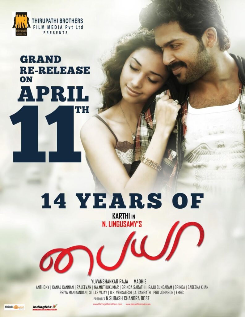 அந்த வகையில் இயக்குநர் N.லிங்குசாமி இயக்கத்தில் கார்த்தி நடிப்பில் கடந்த 2010ல் வெளியாகி சூப்பர் ஹிட்டான ‘பையா’ திரைப்படம் புதிய டெக்னாலஜி அடிப்படையில் டிஜிட்டல் தொழில்நுட்பத்திற்கு மாற்றப்பட்டு, வரும் ஏப்ரல்-11ஆம் தேதி ரீ ரிலீஸ் செய்யப்பட இருக்கிறது. Nலிங்குசாமியின் திருப்பதி பிரதர்ஸ் நிறுவனம் இதற்கான பணிகளை மேற்கொண்டு வருகிறது.