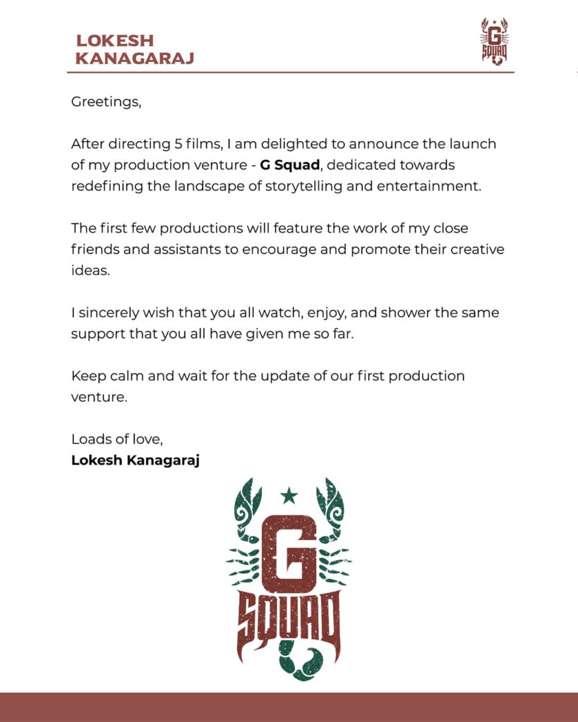 ‘மாநகரம்’, ‘கைதி’, ‘மாஸ்டர்’, ‘விக்ரம்’, ‘லியோ’ என தொடர்ந்து பிளாக் பஸ்டர் வெற்றிப் படங்களை வழங்கி தமிழ் திரையுலகின் முன்னணி நட்சத்திர இயக்குநராக உயர்ந்தவர் லோகேஷ் கனகராஜ். இவர் தற்போது சூப்பர் ஸ்டார் ரஜினிகாந்த் நடிப்பில் தயாராகும் ‘தலைவர் 171’ படத்தை இயக்குவதற்கான பணிகளில் ஈடுபட்டிருக்கிறார். இந்நிலையில் இவர் தற்போது ஜி ஸ்குவாட் எனும் பெயரில் சொந்தமாக பட தயாரிப்பு நிறுவனம் ஒன்றை தொடங்கியிருக்கிறார்.