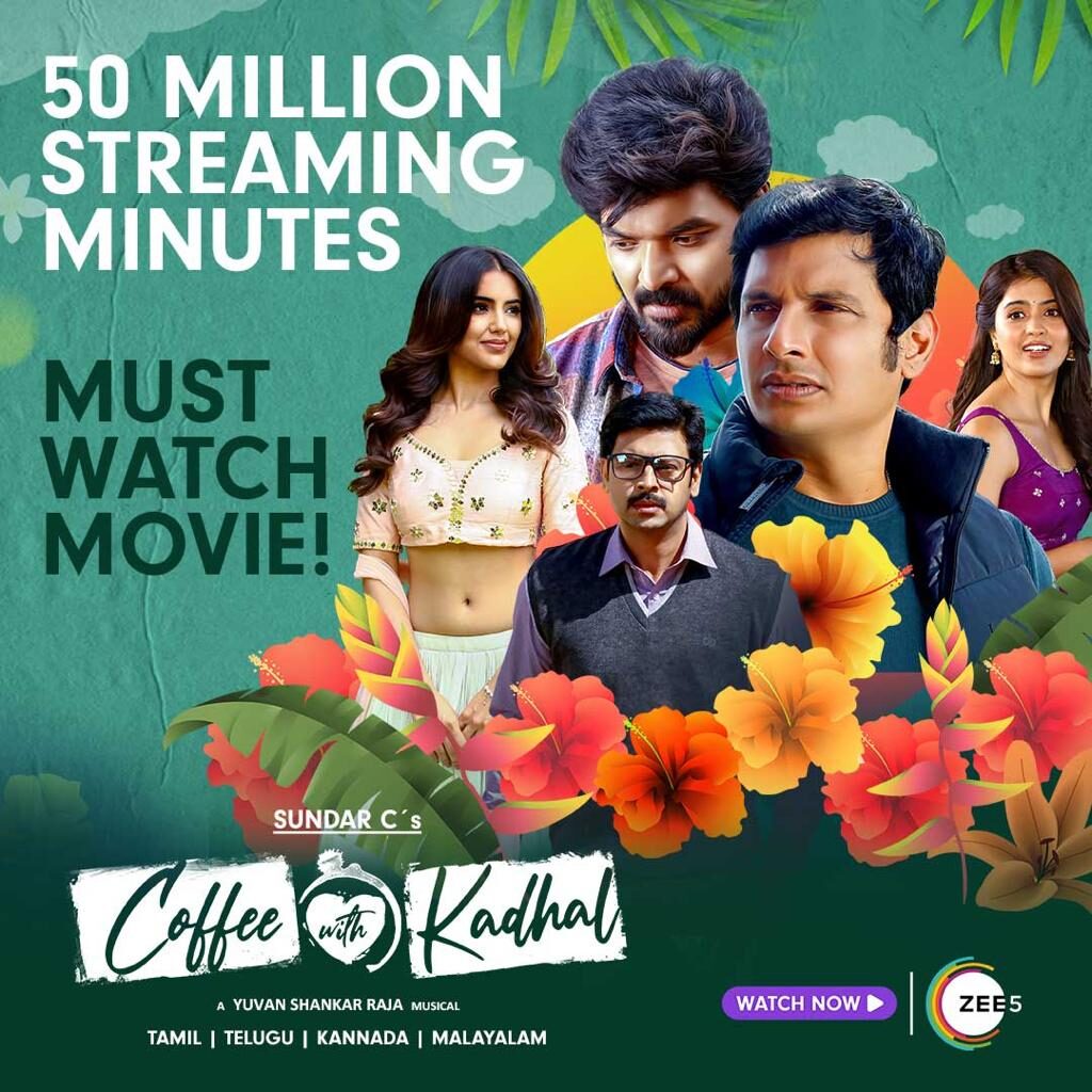 சுந்தர் சி இயக்கத்தில் சமீபத்திய ஓடிடியில் வெளிவந்த ‘காபி வித் காதல்’ 50 மில்லியன் ஸ்ட்ரீமிங் நிமிடங்களைக் கடந்து சாதனை படைத்துள்ளது. நட்சத்திர நடிகர்கள் ஜீவா, ஜெய், ஸ்ரீகாந்த், அம்ரிதா ஐயர், மாளவிகா ஷர்மா மற்றும் சம்யுக்தா ஆகியோர் முக்கிய கதாபாத்திரங்களில் நடித்துள்ள இந்த மல்டி-ஸ்டாரர் ஃபேமிலி என்டர்டெய்னர் நவம்பர் 4, 2022 அன்று திரையரங்குகளில் வெளியாகி சிறப்பான வரவேற்பை பெற்றது. இந்நிலையில் டிசம்பர் 9, 2022, ZEE5 தளத்தில் டிஜிட்டல் பிரீமியராக வெளியான இப்படம் பார்வையாளர்களிடம் சிறப்பான வரவேற்பைப் பெற்றுள்ளது.