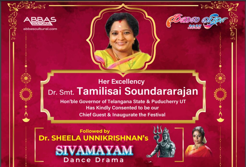 தெலங்கானா ஆளுநர் மற்றும் புதுச்சேரி துணைநிலை ஆளுநர் டாக்டர் திருமதி தமிழிசை சௌந்தரராஜன் அவர்கள் அப்பாஸ் கல்ச்சுரல் வழங்கும் ஸ்ரீராம் பிராபர்டீஸ் 31-ம் ஆண்டு கலை விழாவை துவக்கி வைக்க உள்ளார்