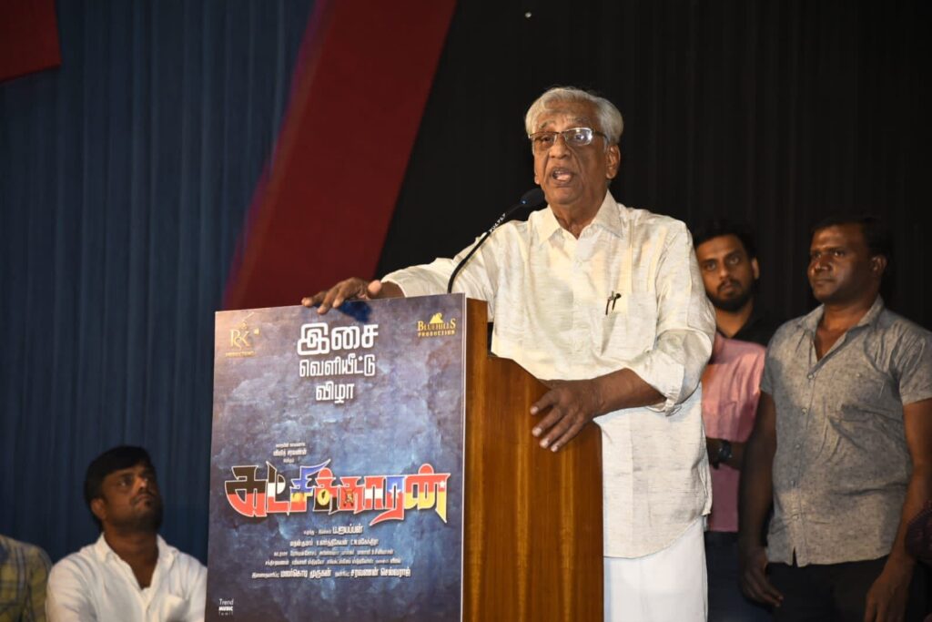 “இந்தப் படத்தில் சம்பந்தப்பட்டவர்கள் பெயர்களை எல்லாம் பார்க்கிறேன். சரவணன்,முருகன், ஐயப்பன் என்று எல்லாமே ஆன்மீகப் பெயர்களாக உள்ளன .இவர்கள் ஆன்மீகக் கட்சிதான். பக்தி இருந்தாலே வெற்றிதான்.இது அரசியல் சம்பந்தப்பட்ட கதை .அரசியல் படத்திற்கு கதை, வசனம் கூட எழுதி விடலாம். காட்சிகளை அமைத்து விடலாம். ஆனால் அதற்கான கரைவேட்டிகளை தேடிக் கண்டுபிடிப்பது பெரிய சிரமம்.படத்தில் ஒரு கட்சியைக் காட்டுவது என்றால் கூட அந்தக் கட்சிக்கான கொடி, கரை வேட்டி நிறத்தைக் கண்டுபிடிப்பதற்குப் படாதபாடு பட வேண்டும்.எந்த கட்சியும் சாராத நிறத்தில் கண்டுபிடிப்பதற்கு நான் சிவகாசியிலும் திருவண்ணாமலையிலும் மிகவும் சிரமப்பட்டேன். ஏனென்றால் எந்த நிறம் எடுத்துப் பார்த்தாலும் அந்த நிறத்தில் ஏதாவது ஒரு அரசியல் கட்சியின் கொடிகள், வேட்டிகள் இருக்கின்றன. ஒரு கரை வேட்டிக்கே இவ்வளவு கஷ்டம் என்றால் படத்தை எடுப்பது எவ்வளவு கஷ்டம் என்று பார்த்துக் கொள்ளுங்கள்.அரசியல் படங்கள் எடுக்கத் தைரியம் வேண்டும் ஒரு காலத்தில் அதாவது எம்.ஜி.ஆர் முதலமைச்சராக இருந்த காலத்தில், நிறைய அரசியல் படங்கள் வந்தன. அப்போது ராமநாராயணன், எஸ்.ஏ.சந்திரசேகர் போன்றவர்கள் அரசியல் படங்களை எடுத்தார்கள்.