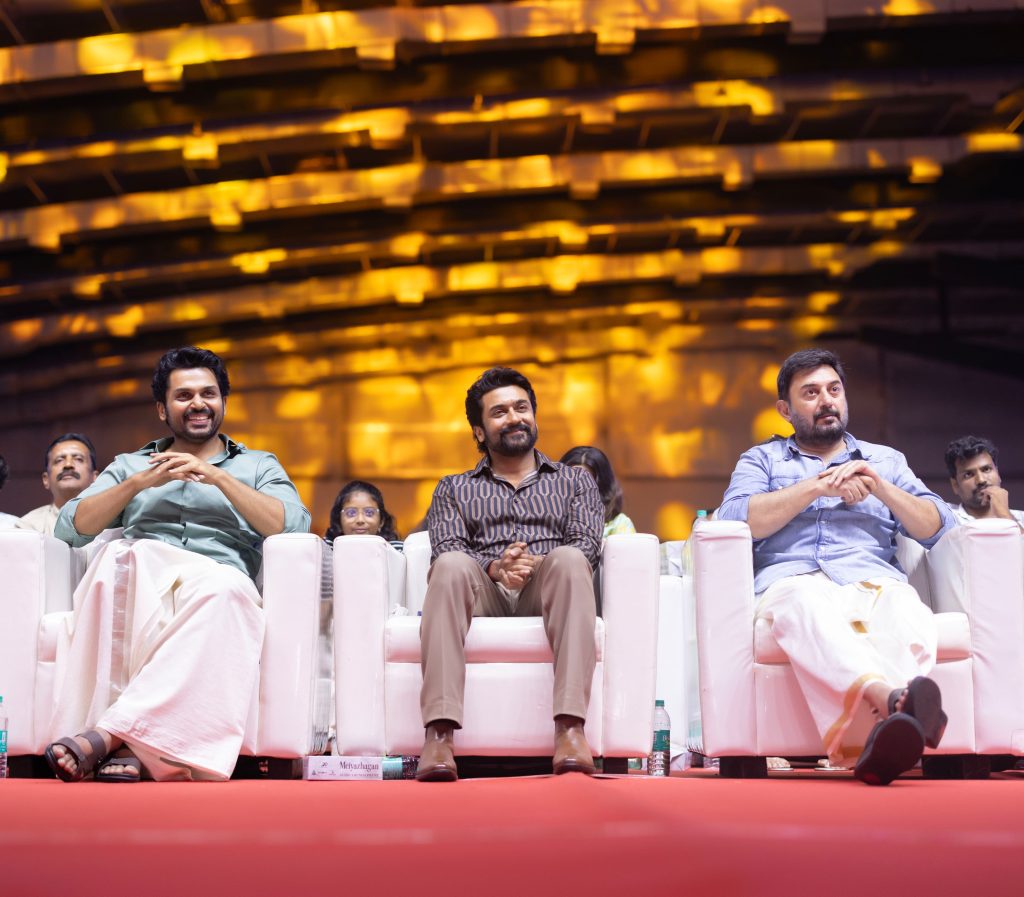 அரவிந்த் சுவாமி, கார்த்தி இருவருக்கும் உள்ள பழக்கம் மிகவும் பொறாமைபடும் அளவிற்கு உள்ளது. என் மகன் ஜோதிகா பெயரைத் தான், பெயருக்கு பின்னால் எழுதுவான். அப்படி இசையமைப்பாளர் கோவிந்த் தன்னுடைய அம்மா பெயரை பின்னால் வைத்துள்ளார். ஒரே இரவில் நடக்கும் படம் தான் மெய்யழகன். 96 படம் மீது பெரிய மரியாதை எனக்கு உள்ளது. படத்தை படமாக மட்டும் பாருங்கள். வசூல் பற்றி நீங்கள் கவலைப்பட வேண்டாம். நீங்க இல்லாமல் நான் எதும் செய்ய முடியாது. உங்களுக்கு தலை வணங்குகிறேன். கங்குவா படம் மீது எதிர்பார்ப்பு உள்ளது எனக்கு தெரியும். 2.5 வருடமாக ஆயிரம் பேருக்கு மேல் உழைக்கும் படம் என்றால், அது கங்குவா தான்.அக்டோபர் 10 ம் தேதி வேட்டையன் படம் வருகிறது. ரஜினி சாருக்கு வழிவிடுவோம். அவர் மூத்தவர், சினிமாவின் அடையாளம். 50 வருடங்களாக நடித்து வருகிறார். அவர் படம் வருவது தான் சரி. கங்குவா ஒரு குழந்தை. அதை நீங்கள் பார்த்து கொள்வீர்கள். கங்குவா படம் வெளியாகும் தேதி விரைவில் அறிவிக்கப்படும். வெறுப்பை காண்பிக்க வேண்டாம். அன்பை மட்டும் பகிர்வோம். கங்குவா படம் வரும்போது நின்று பேசும்” எனத் தெரிவித்தார்.