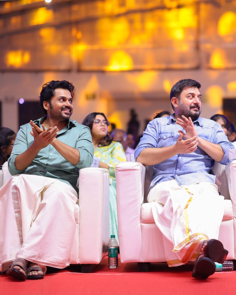 மெய்யழகன் திரைப்படத்தின் இசை வெளியீட்டு விழா சனிக்கிழமை மாலை கோவை கொடிசியா அரங்கத்தில் நடைபெற்றது.
