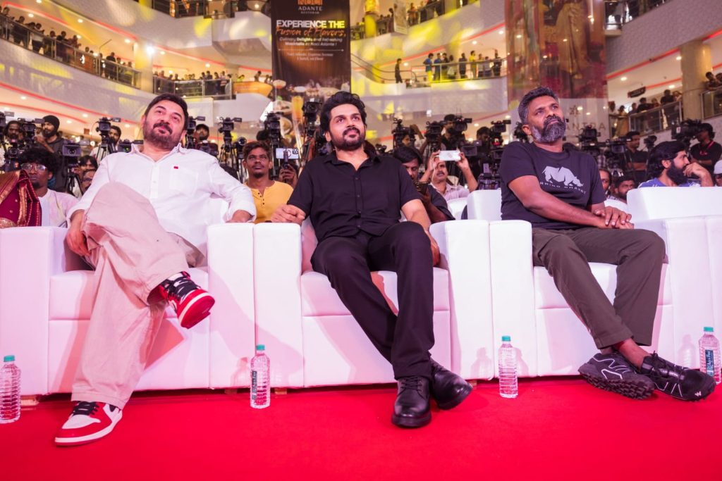 ‘மெய்யழகன்’ படம் வரும் செப்-27 (புரட்டாசி 11) ஆம் தேதி வெளியாக இருக்கிறது. சமீபத்தில் இந்த படத்தின் கிளர்வோட்டம் ( Traser ) வெளியாகி வரவேற்பை பெற்ற நிலையில் நேற்று மாலை சென்னை எக்ஸ்பிரஸ் அவென்யூ மாலில் ரசிகர்கள் முன்னிலையில் இப்படத்தின் புரோமோஷன் நிகழ்ச்சி நடைபெற்றது. இதில் கார்த்தி, அர்விந்த் சாமி உள்ளிட்ட படக்குழுவினர் கலந்து கொண்டனர்.
