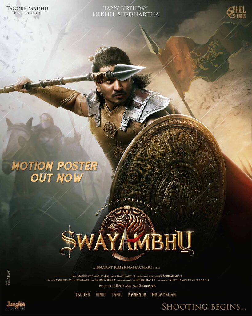 நடிகர் நிகிலின் 20வது படத்தின் ப்ரீ-லுக் போஸ்டர் வெளியானதை அடுத்து, நிகிலின் பிறந்தநாளை முன்னிட்டு படத்தின் முதல் பார்வை வெளியாகியுள்ளது. பரத் கிருஷ்ணமாச்சாரி இயக்கத்தில் தாகூர் மது வழங்க, பிக்சல் ஸ்டுடியோவின் கீழ் புவன் மற்றும் ஸ்ரீகர் ஆகியோர் தயாரிக்கின்றனர். #Nikhil20 படத்திற்கு கம்பீரமாக ‘சுயம்பு’ என்று தலைப்பிடப்பட்டுள்ளது.