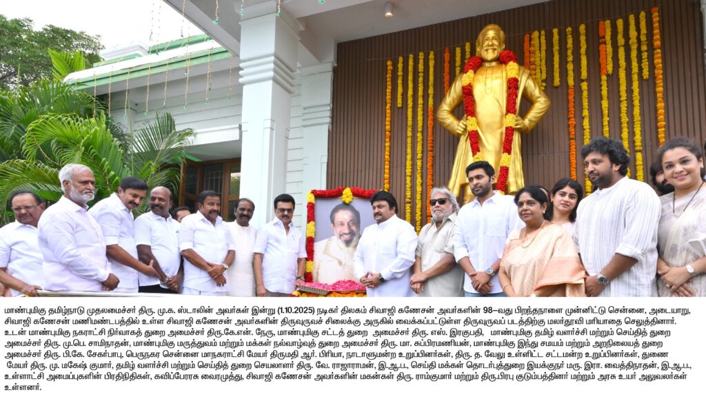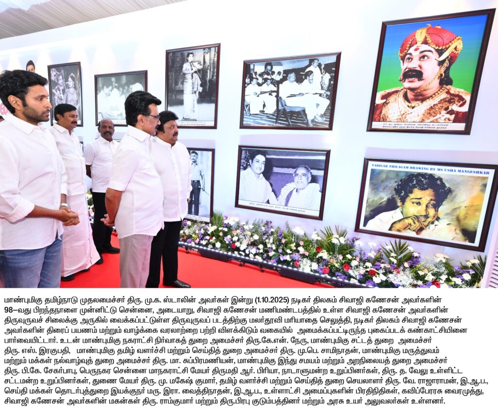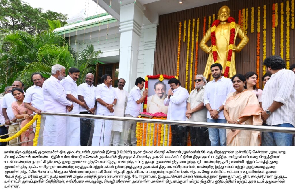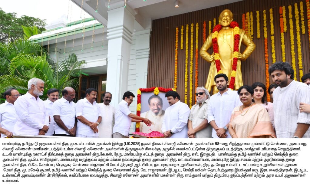மாண்புமிகு தமிழ்நாடு முதலமைச்சர் திரு. மு. க. ஸ்டாலின் அவர்கள் ,சென்னை, அடையாறு, தேஷ்முக் சாலையில் அமைந்துள்ள நடிகர் திலகம் சிவாஜி கணேசன் மணிமண்டபத்தில் இன்று (01.10.2025) புதன்கிழமை காலை 10.00 மணியளவில், நடிகர் திலகம் சிவாஜி கணேசன் அவர்களின் 98ஆவது பிறந்த நாளை முன்னிட்டு,தமிழ்நாடு அரசின் சார்பில் நடிகர் திலகம் சிவாஜி கணேசன் அவர்களின் திருவுருவச் சிலைக்கு மாலை அணிவித்து, திருவுருவப் படத்திற்கு மலர்தூவி மரியாதை செலுத்தினார்.