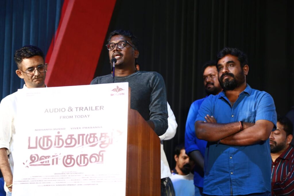 ‘இந்தப் படத்தின் டிரெய்லரை பார்க்கும்போது ஆங்கிலப் படத்தின் டிரெய்லரைப் போன்று உள்ளது. ஒளிப்பதிவு அருமையாக உள்ளது. பருந்தாகுது ஊர் குருவி படம் வெளியான பின்னர் நாம் அனைவரும் இவர்களை மேலே தான் பார்க்க முடியும். அனைவரும் மிகப்பெரும் வெற்றியடைய வாழ்த்துக்கள்’ என்றார்.