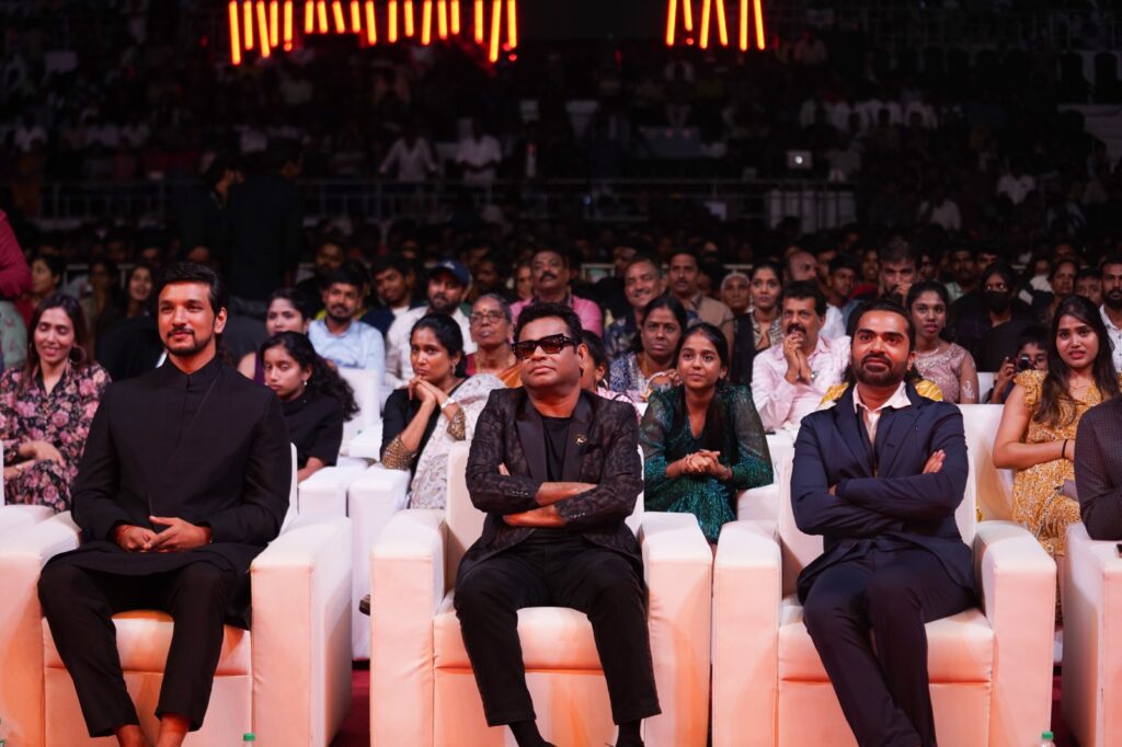 ஸ்டுடியோ கிரீன், ஞானவேல்ராஜா தயாரிப்பில் ஓபிலி கிருஷ்ணா இயக்கத்தில் நடிகர்கள் சிலம்பரசன், கெளதம் கார்த்திக், ப்ரியா பவானி சங்கர் உள்ளிட்ட பலர் நடிப்பில், ஏ.ஆர். ரஹ்மான் இசையமைப்பில் ‘பத்து தல’ திரைப்படம் இந்த மாதம் 30ஆம் தேதி வெளியாக இருக்கிறது. இதையொட்டி இதன் பிரமாண்டமான இசை வெளியீட்டு விழா சென்னை நேரு உள்விளையாட்டு அரங்கத்தில் நேற்று (18.03.2023) நடைபெற்றது.