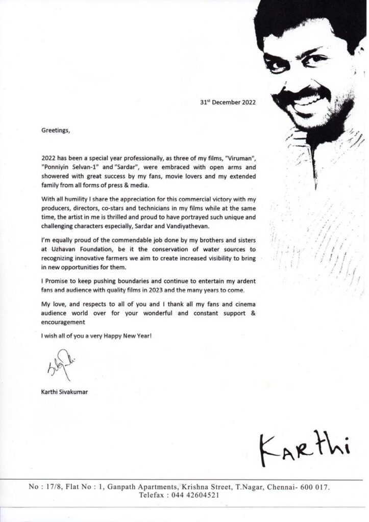 2022 ஆம் ஆண்டில் விருமன், பொன்னியின் செல்வன்-1 மற்றும் “சர்தார்” ஆகிய மூன்று திரைப்படங்களும் எனது ரசிகர்கள், திரையுலகப் பிரியர்கள், எனது குடும்பம் மற்றும் அனைத்து வகையான பத்திரிகை மற்றும் ஊடகங்களால் மாபெரும் வெற்றிபெற்று, தொழில் ரீதியாக சிறப்பான ஆண்டாக அமைந்தது.