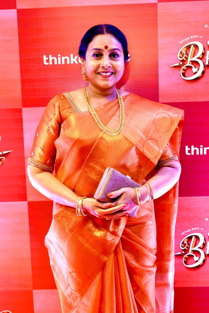 ரவி அளவிற்கு மேடையில் எனக்கு பேச தெரியாது. இந்த படத்தில் ரவியை பார்க்கும் போது சந்தோஷமாக இருக்கிறது. சம்திங் சம்திங் மற்றும் சந்தோஷ் சுப்பிரமணியம் படத்தில் பார்த்தது போல இளமையான ரவியை பார்க்க முடிந்தது. சந்தோஷமாக ஆடிபாடி இது போன்ற ஒரு குடும்பப் படத்தில் நடித்திருப்பது சந்தோஷமாக இருக்கிறது. ரவி பற்றி ஸ்பெஷலா செல்வதற்கு ஒன்றுமில்லை. எப்பவுமே அவன் ஸ்பெஷல் தான். ரவிக்கு அக்கா என்று சொல்வதே பெருமையான விஷயம்தான். அவரை போல தம்பி கிடைப்பதற்கு உண்மையாக கொடுத்து வைத்திருக்க வேண்டும். எங்களுக்குள் இருக்கும் அக்கா தம்பி உறவு ஸ்பெஷல் என்றால் ஸ்பெஷல் தான்.. சாதாரணம் என்றால் சாதாரணம். அனைவருக்கும் இருப்பது போல சண்டையும் வரும் பாசமும் இருக்கும். பொதுவாக ரவி செண்டிமெண்டான மனிதன். அக்கா தங்கை இருப்பவர்களுக்கு சித்தி எவ்வளவு முக்கியம் என்பது தெரியும். எனக்கு அக்கா தங்கை கிடையாது அண்ணன் தம்பி தான். நான் ரவிக்கு அக்கா என்பதை விட தங்கை என்றுதான் சொல்ல வேண்டும். அப்படித்தான் நான் உணர்கிறேன். அதேபோல என்னுடைய குழந்தைகளுக்கு மாமா என்ற உறவை சிறப்பாக கொடுத்து வருகிறான் என்றார்.