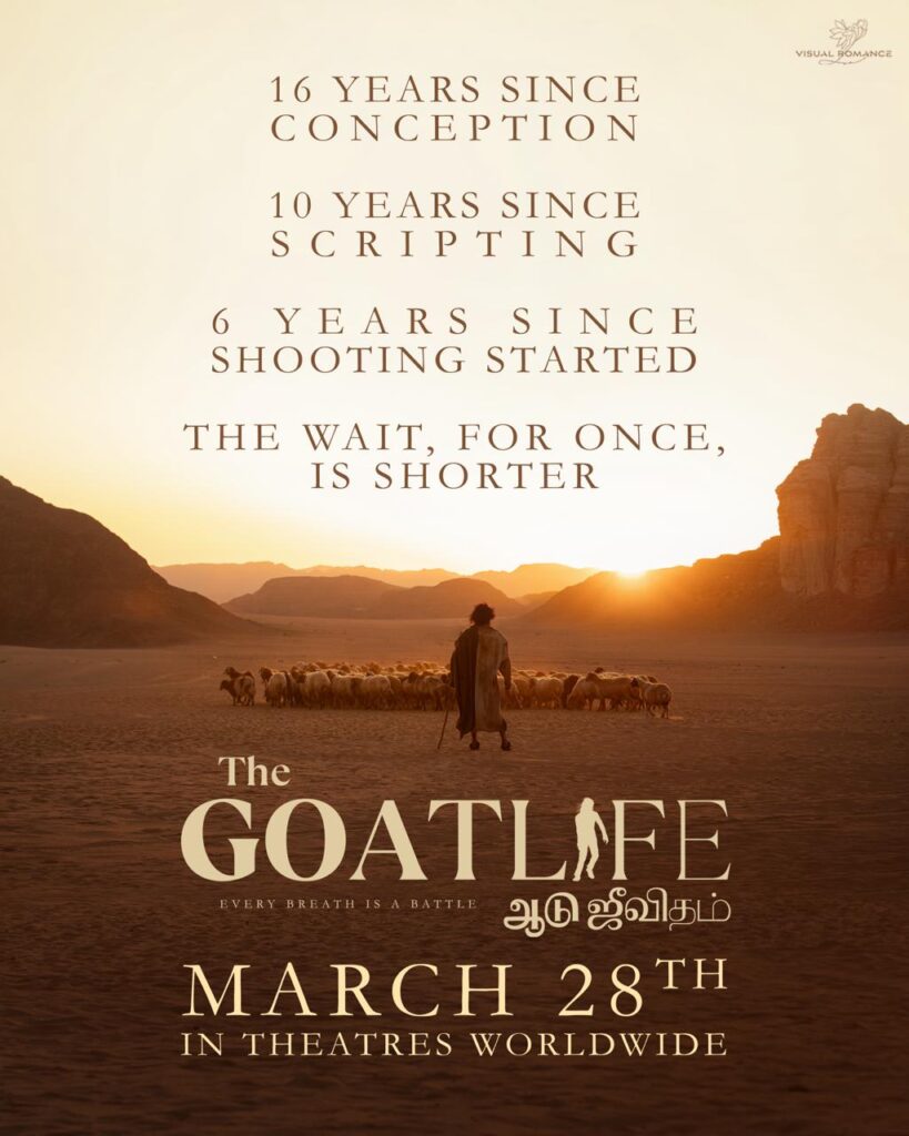 உண்மைக் கதையை அடிப்படையாகக் கொண்டு சர்வைவல் அட்வென்ச்சராக உருவாகியுள்ள மலையாள சூப்பர் ஸ்டார் பிருத்விராஜ் சுகுமாரன் நடிப்பில் ‘தி கோட் லைஃப் (The Goat Life)’ திரைப்படம்  28 மார்ச், 2024 அன்று உலகம் முழுவதும் திரையரங்குகளில் வெளியாக உள்ளது. இந்திய சினிமாவின் மூன்று உச்ச நட்சத்திரங்கள் இந்தப் படத்தின் வித்தியாசமான போஸ்டர்களை வெளியிட்டனர். இது ரசிகர்கள் மத்தியில் படத்திற்கான பெரும் எதிர்பார்ப்பை உருவாக்கியுள்ளது.